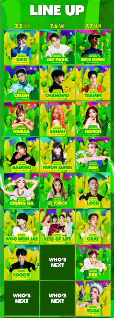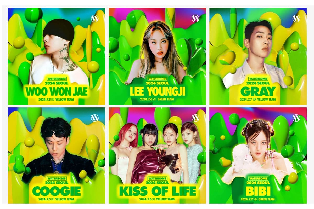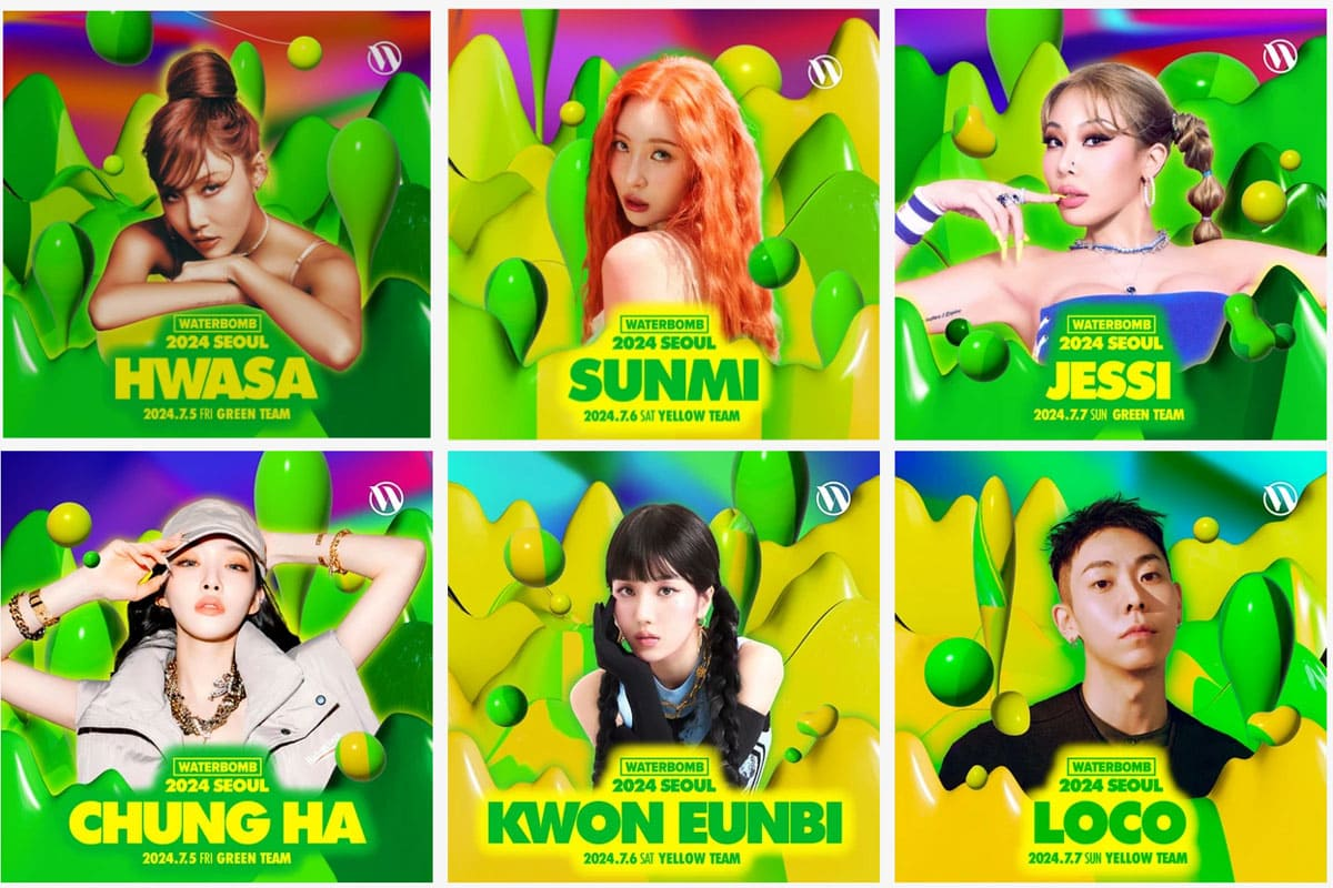 워터밤 서울 2024 라인업을 모두 2팀으로 나눠 워터 파이팅 대결을 하는 방식으로 진행됩니다.
